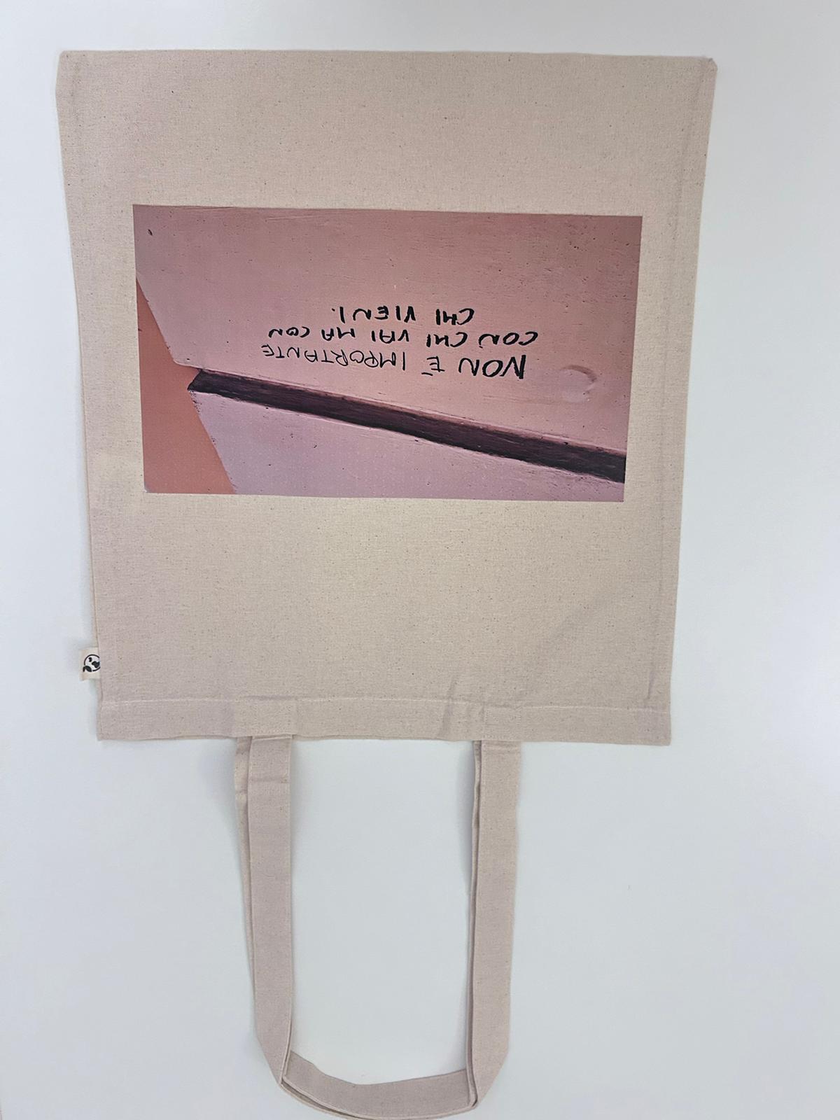 Borsa in tela naturale con stampa fotografica ispirata alle scritte sui muri di Bologna