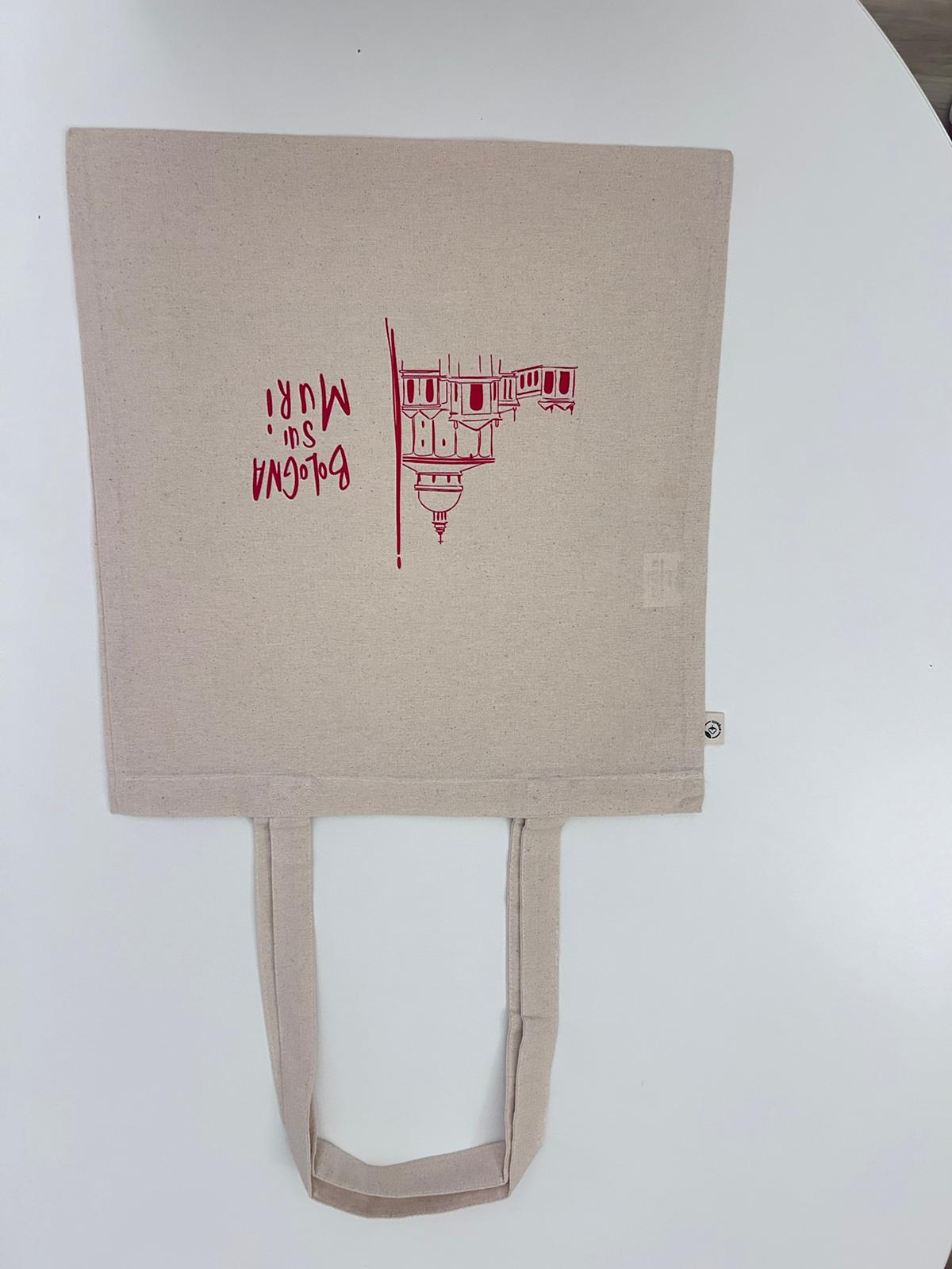 Borsa in tela naturale con stampa fotografica ispirata alle scritte sui muri di Bologna